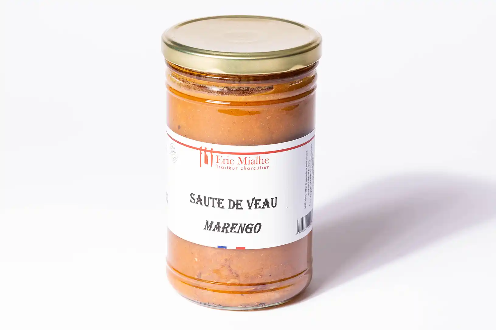 Sauté de veau Marengo en conserve, préparé maison avec du veau tendre et une sauce tomate mijotée aux petits légumes.
